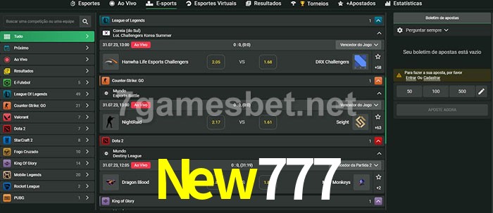 O New777 oferece uma grande seleção de opções de apostas em e-sports com probabilidades competitivas
